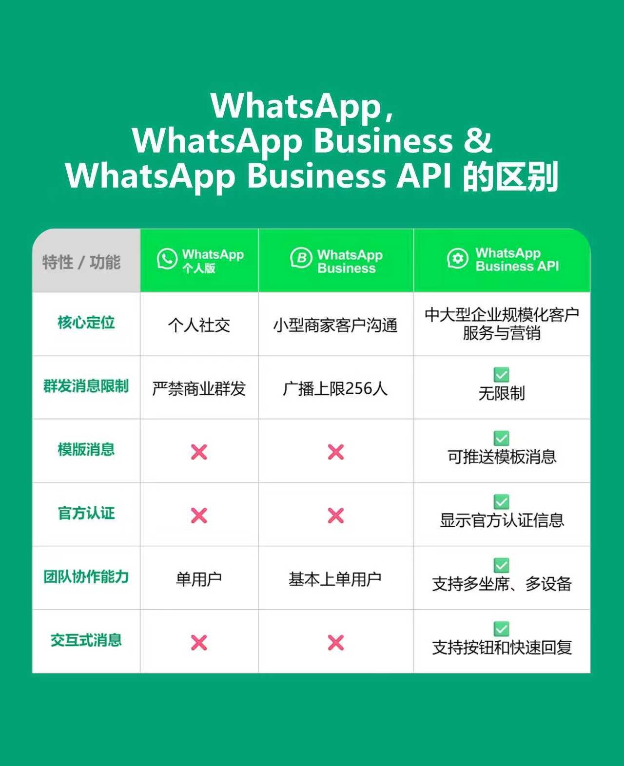 为中大型企业提供,通过 API 形式访问。允许创建多个WhatsApp商业帐户,大规模批量发送消息、自动回复。